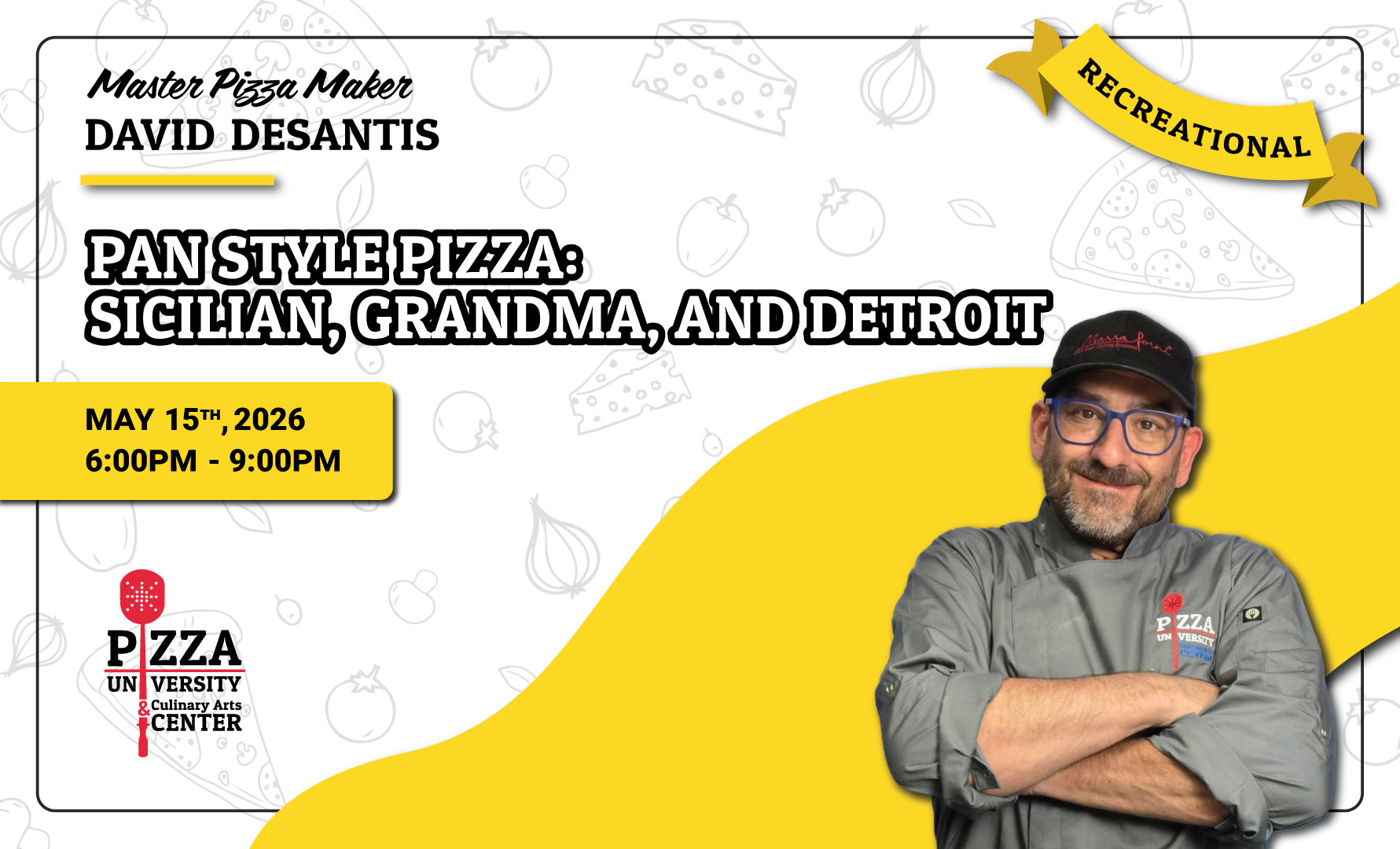 Explore hearty, thick-crust American classics — crispy-bottom Sicilian squares, sauce-on-top Grandma pies, and caramelized cheesy-edged Detroit pans — all built from the same versatile dough using different pan techniques and bold flavors. You’ll work with pizza dough, prepare a variety of sauces, practice pressing dough into pans, and top, bake, and enjoy several sampler pizzas from all three styles.